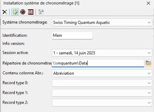 Pour s’échanger les informations, le PC du Meet Manager doit pouvoir accéder au dossier de l’ordinateur Quantum dans lequel sont stockées toutes les informations de la compétition. Pour vérifier cela, créez votre session dans le Quantum comme expliqué au point 3 de ce document. La compétition va être créée par défaut dans le dossier C:\SwissTiming\DRC64Data\Quantum\Swimming\Data