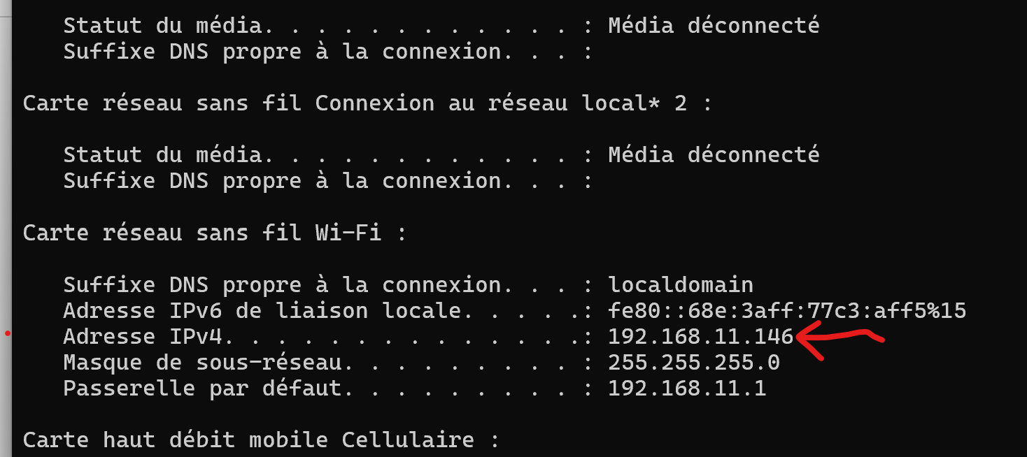 Avec la commande "ipconfig", affichez l'adresse IP de votre ordinateur. Est indiquée sous "Adresse IPv4".